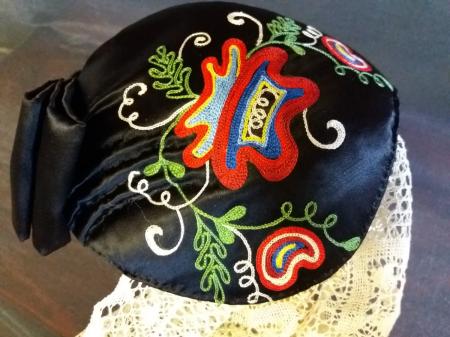 Svart botten, broderier i grönt, rött, blått, gult och vitt. Från Föglö.