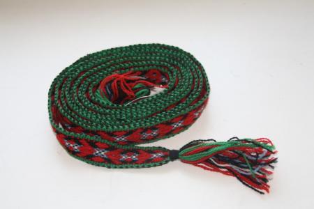 Vävt band i rött, grönt, svart, vitt och blått. Fransar i ändarna. Från Hitis.