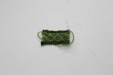 Vävt band på ljusgrönt botten med vitt och svart mönster. Från Föglö.