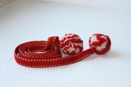 Knäband, vävda i rött och vitt. Från Lappträsk. Ena bandet (a-bandet) försvunnet.