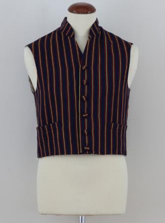 Västen av smalrandigt halvylletyg i symmetriska ränder i rött och gult på mörkblå botten. Västen har 6 överklädda knappar och uppstående krage utan uppslag.