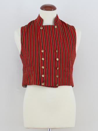 Västen är av smalrandigt halvylletyg på röd botten. Västen har 6 mässingsknappar i två rader och låg krage.