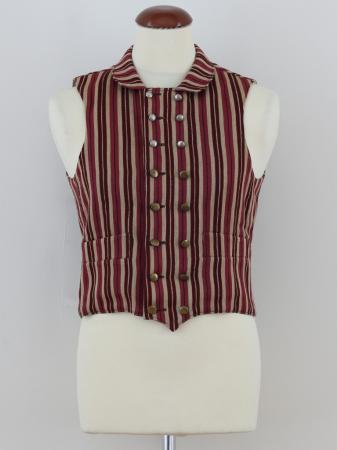 Väst av smalrandigt halvylletyg i smala ränder i gråbeige, rödbrunt och gredelint. Västen har 8 par nickel knappar i två rader, tre översta paren mindre. Västen har nedvikt krage utan uppslag.