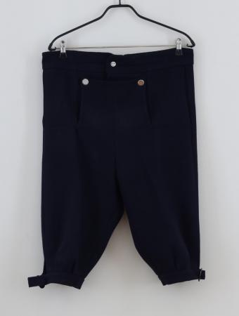 Knäbyxor av mörkblå vadmal med smal lucka knäppt med två nickelknappar. Vid knäna ovala nickelspännen