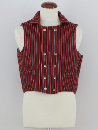 Västen av smalrandigt halvylletyg i smala symmetriska ränder i grupper på grannblå botten. Västen har 5 par mässingsknappar i två rader och nedvikt krage med rundade hörn utan uppslag. Översta paret av knappar på ett längre avstånd från de andra.