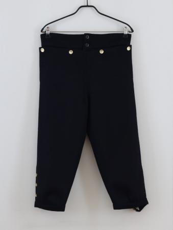 Knäbyxor av mörkblå vadmal med bred lucka knäppt med fyra stölingar. Vid knäna ovala mässingsspännen, 3 stölingar vid knäsprundet.