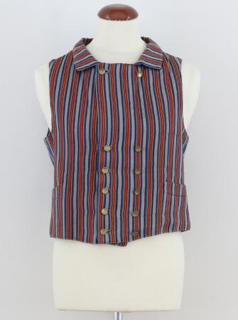 Väst av smalrandigt halvylletyg i smala symmetriska ränder i svart, blått, gult och rött på stålgrå botten. Västen har 5 mässingsknappar i två rader och nedvikt krage med rundade hörn utan uppslag. Översta paret av knappar på ett längre avstånd från de andra.