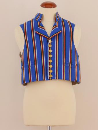 Väst av smalrandig halvylle i vitt, grönt, rött, gult och svart på blå botten, ståkrage och små uppslag, knäppt med 8 små mässingsknappar, så kort att skjortan syns.