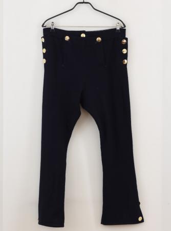 Mörkblå långbyxor med en bred och en smal lucka, den smala luckan knäppt med 2 stora mässingsknappar och den breda luckan med 3 mässingsknappar längs med sidan, snäva upptill och vid knäna, men bredare nertill, byxbenen har nertill ett sprund prytt med 3 mässingsknappar ( en vid sprundets övre ända och en på vardera fliken nertill) under knäna kan byxbeneb bindas om med vävda band.