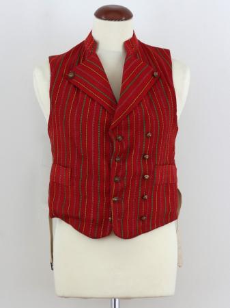 Smalrandig väst med ränder i rosengång i grönt, gult, svart, vitt och rött på röd botten, låg krage, 6 par små wasapuggar, det översta paret knäppt genom slaget.