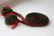 | Vävt band, mörkröd botten med mörkgröna inslag. Från Korpo. | |
