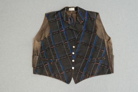 Grannrutig sidenväst i svart o. något blått, vitt o. ljusrött med nedvikt krage med mycket trubbvinkliga hörn och uppslag. 4 pärlemoknappar i en rad med långa snibbar nedtill, två snett sydda fickor. Rutränderna gå i spetsig vinkel nedåt. Ryggstycke av mörkt bomullstyg med tränsar med 3 hål i vardera tränsade i blått.
