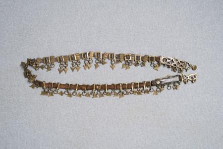 Söljebälte med hjärtan som hänger på två olika modeller av sölja, alla med hjärthänge. Genombrutet mönster på knapplåset. Stämpel i låset ”G Blomqvist”. Några hjärtsöljor saknas. Litet hänge; B: 0,9 cm, H: 4,5 cm, stort hänge; B: 1,2 cm, H: 4,5 cm, knapplås; B: 5 cm, L: 18,5 cm.