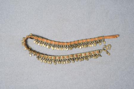 Kommentar: Söljebälte med små stjärnor. Alla blecken har likadant litet stjärnhänge. Ena låsdelen saknas. B: 0,4 cm, H: 3,6 cm, bältets längd: 76 cm.