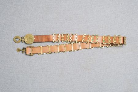 Kommentar: Genombrutna bleck. Läderremmen trädd genom blecken. B: 3,3 cm, H: 4 cm, låset; L: 15,5 cm, H: 4,5 cm, bältets längd: 103 cm.