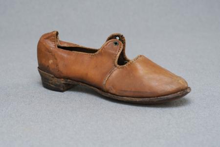 Läder, klack och botten handsydda. Ena skon försvunnen. B: 8 cm, H: 8,5 cm, L: 24,5 cm.