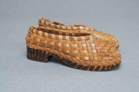 Kommentar: Näverskor med träbotten. Ovantåg flätad näver och bottnens trä dekorerad med bränning. Ena skon trasig i hälen. Kristida fabrikat. B: 8 cm, H: 8 cm, L: 15 cm.
