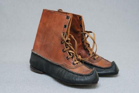 Kommentar: Ett par dampjäxor i svart och brunt. Halvbotten och hälen av tjockt läder, spikat med tränubbar. Maskinsydda. Nytillverkade för museet. B: 10 cm, H: 19 cm, L: 6 cm.