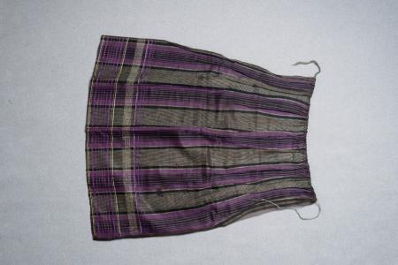 A20. Randigt sidenförkläde med ränder längsmed i svart, vitt o. gredelint samt nedtill bårdränder i samma färger, rynkat på ett snöre upptill. Kommentar: Crepelin som stöd under hela förklädet. B: 64 cm, H: 67 cm.