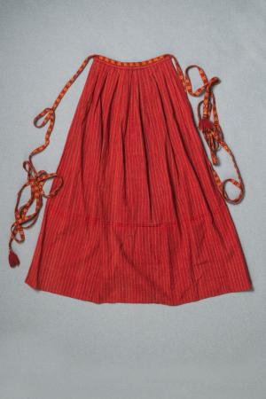 2) Rödbottnigt förkläde med fina ränder i svart o. gult, veckat från var sida med inåt-vänt motveck i mitten, har haft ett smalt tvärveck. Har rödgula vävda ”8-band”, 1,5 cm brett, med små tofsar i ändan.