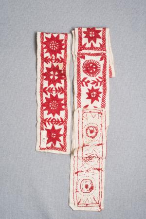 Rött brodergarn på rätsidan, traskant på långsidor. Verkar vara bortklippta av tyget. B: 11 cm, L: 154 cm + 50 cm.