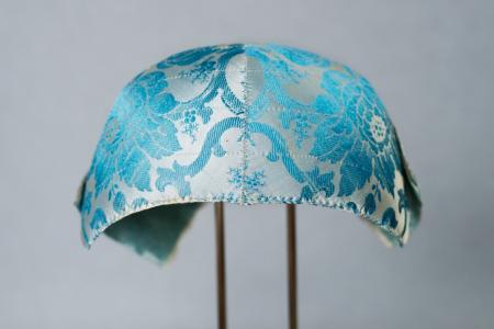 Starkt blått jacquard/mönstervävt sidentyg, blommor på satinbotten. Rak framkant, fyra stickningar. Mönstervävd ljusare blå enkel rosett, pappersstyvning. Rosetten fastsydd. Foder av vit lärft. Dragband av tvinnat lingarn. B: 17 cm, H: 6 cm, rosett; B: 10 cm, L: 27 cm.
