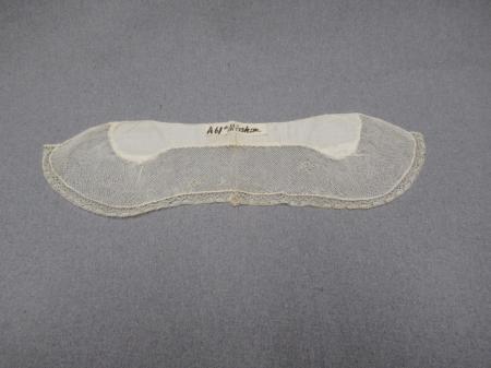 A61. a, b, Juni 1922 Mörskom Kankböle Stycke till bindmössa b) sorgstycke. Kommentar: Kantspets, ”Kouknatto”, dubbel tyll med maskin. B: 7,5 cm, L: 38,5 cm, H: 9,5 cm.