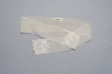 A62. Juni 1922 Mörskom Kankböle Krås av tyll med inträtt mönster i vardera ändan. Kommentar: Välbevarat. B: 9 cm, L: 124 cm.