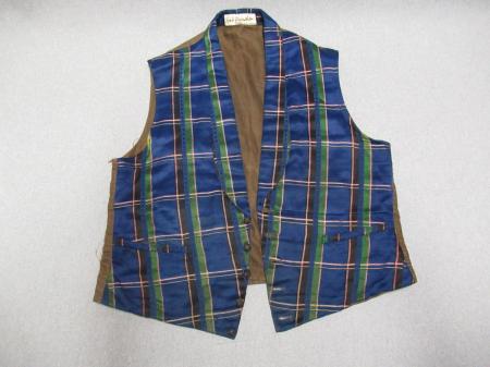 Väst av storrutigt sidentyg i grannblått, svart, grönt o. något vitt o. ljusrött, schalkrage, 5 kullriga svarta knappar i en rad, raka hörn nedtill, 2 smala rakt sydda fickor, rutränderna på sned, mörk rygg, tränsar med 2 hål.