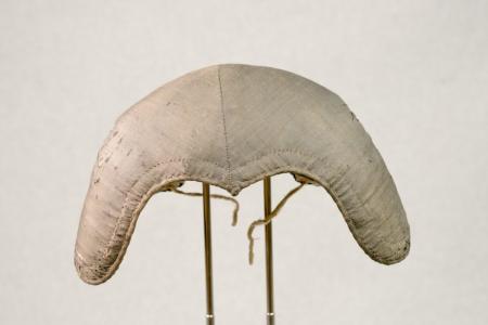 framkanten. En stickning genom stommen, kantad med sidenband till avigan. Foder av linnelärft. Dragband av vävt kantband. Små skador i tyget. B: 20 cm, H: 9 cm.
