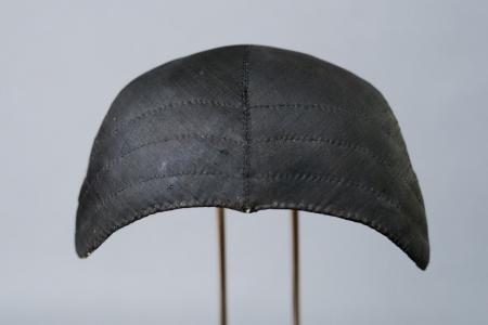 Siden, nästan rak i framkanten. Tre stickningar framtill, foder av tunn linnelärft. Inskrivet med blyerts i fodret: BRAGE. Något sliten i framkanten. B: 17 cm, H: 8 cm.