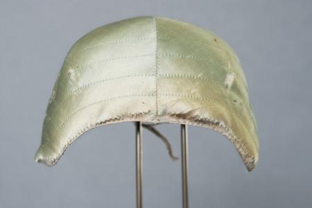 Sidensatin, nästan rak i framkanten. Fyra stickningar framtill. Foder av tryckt kattun i gröna nyanser. Inskrivet med bläck i fodret: BRAGE Borgå. Dragband tvinnat lingarn. Kardat lin och ovanpå kardad ull som stoppning. Framkanten lossnat från stommen samt andra skador. B: 17,5 cm, H: 9 cm.