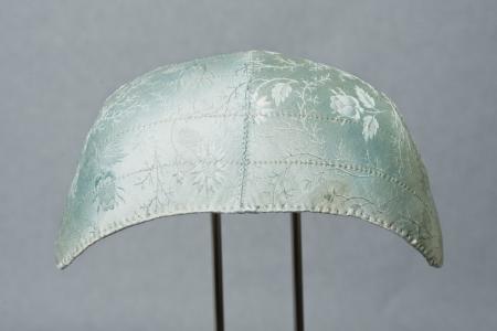 Mönstervävda sirliga blommor på satinbotten. Framkanten nästan rak, fyra stickningar. Foder tryckt kattun, små blommor på rödbrunprickig botten. Dragband av tvinnat lingarn. Inga skador, endast en liten fläck på framkanten. B: 15 cm, H: 7 cm.
