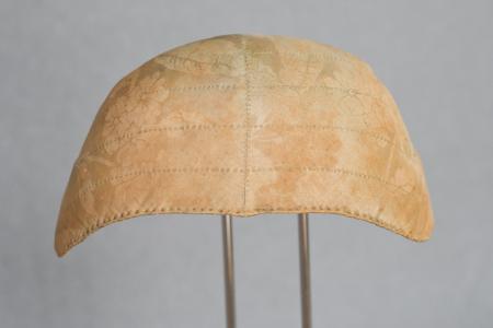 Jacuard/mönstervävt siden, liten modell med nästan rak framkant. Tunt linnetygsfoder, dragband av tvinnat lingarn. Fyra stickningar som dekoration. B: 17,5 cm, H: 8 cm.