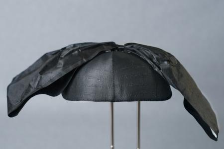 Bindmössa, liten svart med 5 små veck i vinkel o. med mycket stor rosett med uppstående vingar.