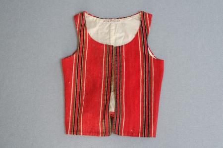 Liv av rödbottnigt randigt tyg ränder i vitt, svart, grönt o. gult, högt urringat framtill, snöres framtill, mittelsöm o. raka sidosömmar i ryggen, extra lappar under armen, ränderna i vinkel i ryggen tre stora skörtveck nedanom midjan i ryggen.