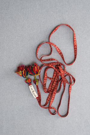 Vävda strumpeband i rött o. gult med 2 tofsar ovan varandra i var ända, använda av karlar att binda om knäet.