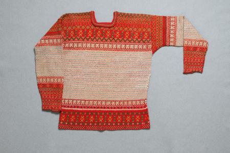 Tät mönstervirkad bård nertill, på axelpartierna, ärmuppsättningen och nertill. Olika mönster med granna färger på röd botten. En del av mönstren också mönsterstickade och fortgående med vit botten med blåa och röda ”loppor”. Fyrkantigt hals hål. Använd, dock bara lite sliten. B: 64 cm, H: 67 cm, ärm: 51 cm.