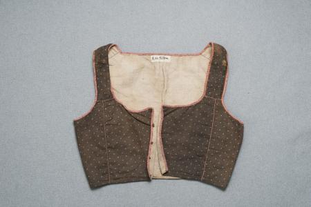 Kvinnolivstycke av svartbottnigt karttun med vita figurer, låg, rund urringning framtill, röd bomulls kantning kring urringning, framkanterna, armhålen o. alla sömmar, ej nedtill, bröstsöm o. 2 tvärsömmar för hängslena, raka sidosömmar, ingen mittelsöm, slätt i ryggen, har häktats med hakar o. hyskor (dessa saknas nu) något. till vänster framtill.