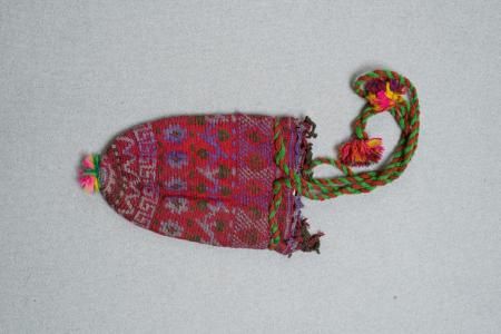 Tobakspung i rött, grönt, hallonrött med grann tofs nedtill o. dragband i rött o. grönt med flerfärgade tofsar.
