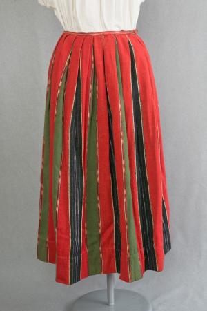 Ingen flat våd framtill, veckad åt båda sidorna med motveck i ryggen, den röda randen genomgående framme. Linningen av annat tyg. Mycket sliten, flera revor i fållen. B: 284 cm, L: 84 cm, vikt in 9 cm, midja: 76 cm.