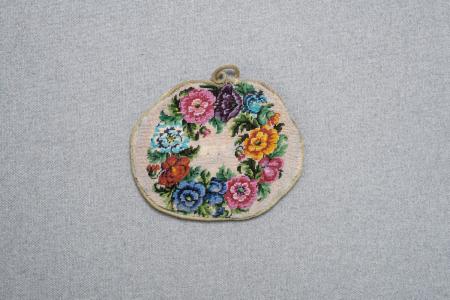 A184. Maj 1926 Pojo Klockdyna med pärlstickeri. Använts av givarinnans farfar. Gåva av Alma Frisk, köksa hos Heikels. Kommentar: Små pärlor i mönstret i blommorna. Foder av bomullsatin, stoppning inuti. B 13 cm, H: 11 cm.