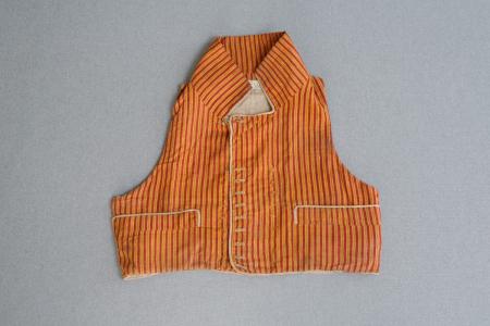 Väst av rödgulrandigt bomulls-tyg i snitt som föreg., men med 1+9 par knappar (som saknas),vita kanter i stället för svarta, knapphålen tränsade i vitt.