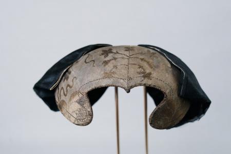 svart band, syns en aning på framsidan . Två raka veck. Foder av kattun i småmönstrat brunt. Rosetten av färdigt satinband, stödd