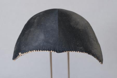 Nästan rak i framkanten, två stickningar. Foder av brun tryckt kattun. Ett dragband av vitt/blått tvinnat garn. Sliten i framkanten. B: 19 cm, H: 9 cm.