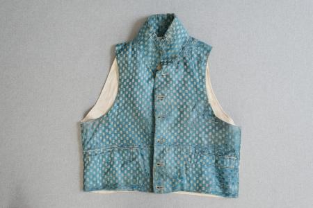Väst av blått siden m. gulvita invävda blommor, hög ståndkrage med trubbvinkliga hörn, 6 st. överklädda knappar i en rad, tätt knäppt under hakan, raka hörn nedtill, kort, 2 fickor, snett sydda, vit rygg utan tränsar.