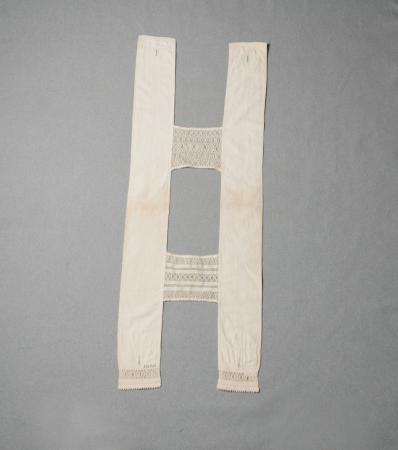 Brudgumshängslen av vitt lärft, 13 cm breda med hålsöm och vita stickningar vid nedre delen av framsidan, mellan hängselbanden både framtill o. bakom en 13 cm hålsömsinsats.