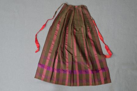 Förkläde med gråbrun botten o. breda o. smala brunvioletta längsgående ränder, nedtill tvärränder i violett o. rött, veckat med 3 veck från var sida, smal linning av samma tyg, fortsatt med rött sidenband.