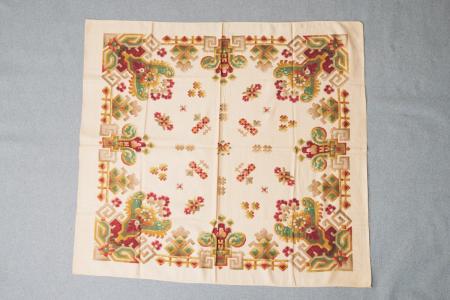 A237. ? Duk med --- botten och stora tryckta figurer, inga fransar. Kommentar: Bomullssjal, stadkanten kvar. Välbevarad.