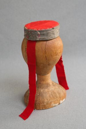 Huva, platt rund huvudbonad, med rött ylle upptill o. C. 4 cm breda helröda ylleband att knytas under hakan.